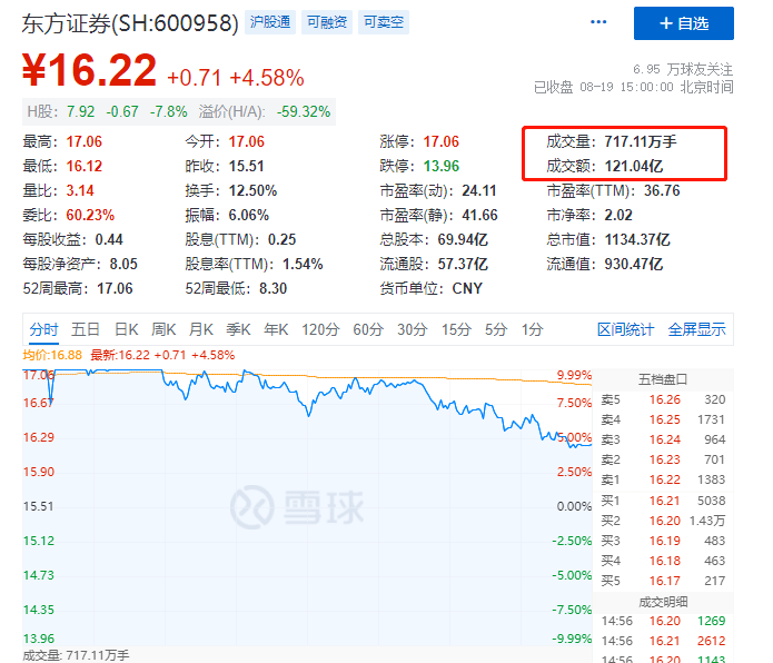 截至收盘,东方证券涨4.58%,成交额121亿元,较昨日全天成交大幅放大,昨日东方证券全天成交41.88亿元。