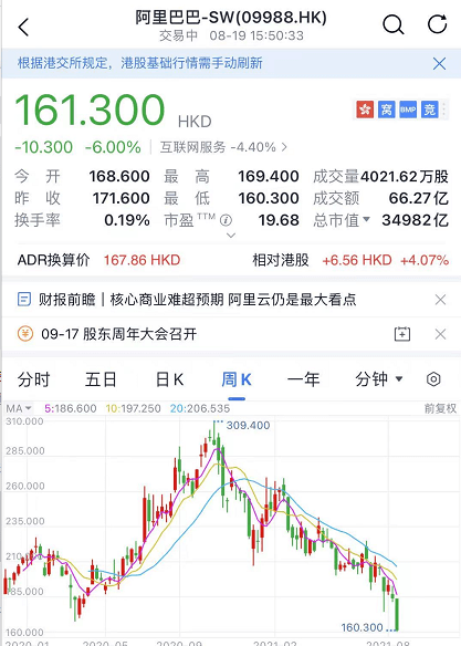 阿里巴巴的港股,已经跌破发行价。市值从去年的高点蒸发了3万亿港币。