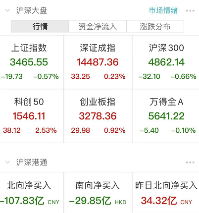 截至收盘,沪指跌0.57%报3465.55点,深成指涨0.23%报14487.36点,创业板指涨0.92%报3278.36点;两市合计成交12150亿元,北向资金净流出107.83亿元。