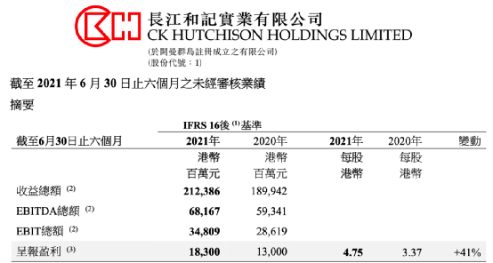8月5日,长和发布2021年上半年业绩报告。报告期内,公司收益总额为2123.86亿港元,同比增加11.82%;普通股股东应占溢利为港币184.4亿元,同比增加40%;每股盈利为港币4.75元,中期股息每股0.8港元。于2021年上半年之普通股股东应占基本溢利较去年同期增加58%。