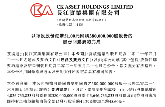 除了场内增持外,李嘉诚家族还对旗下地产上市平台长实集团实施了大量的回购。长实集团6月4日晚间在港交所公告称,以每股股份51.00港元的价格回购3.8亿股股份的股份回购要约完成。