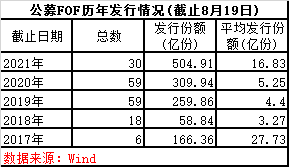 WIND数据显示,截至8月19日,今年以来合计成立了30只FOF基金,合计募集规模达到504.91亿元,平均单只FOF发行规模达到16.83亿元。对比新基金发行规模创出行业历史性纪录的2020年,全年有59只FOF成立,募集规模也仅309.94亿元,显然2021年FOF基金迎来一个大发展。