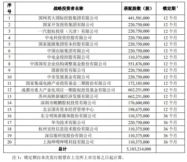 关于战投选择,中国电信指出,战略投资者的选择在充分考虑投资者资质以及和发行人长期战略合作关系等因素后综合确定,主要包括:具有长期投资意愿的国有企业或其下属企业国家级投资基金与发行人具备战略合作关系或长期合作愿景,且有意愿长期持股的投资者。据了解,此次战投中,哔哩哔哩、东方明珠、深信服、中电金投以及安恒信息锁定期为36个月,其余战投锁定期为12个月。