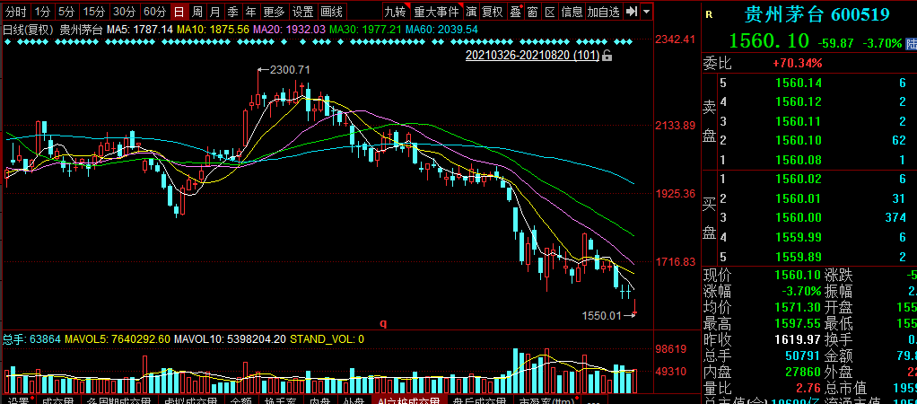 值得注意的是,茅台近期股价下跌调整的过程中,已经呈现出多条均线拐头向下发散的局面,而且还伴随着量能的放大,可见其抛压力度之大。