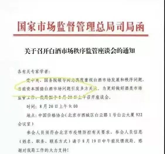 8月20日早间,市场突然流传出一份市场监督管理总局价监竞争局发布的《关于召开白酒市场秩序监管座谈会的通知》。酒企人士表示座谈会主要针对的是资本围猎酱酒及茅台酒价高涨如何控制的问题。