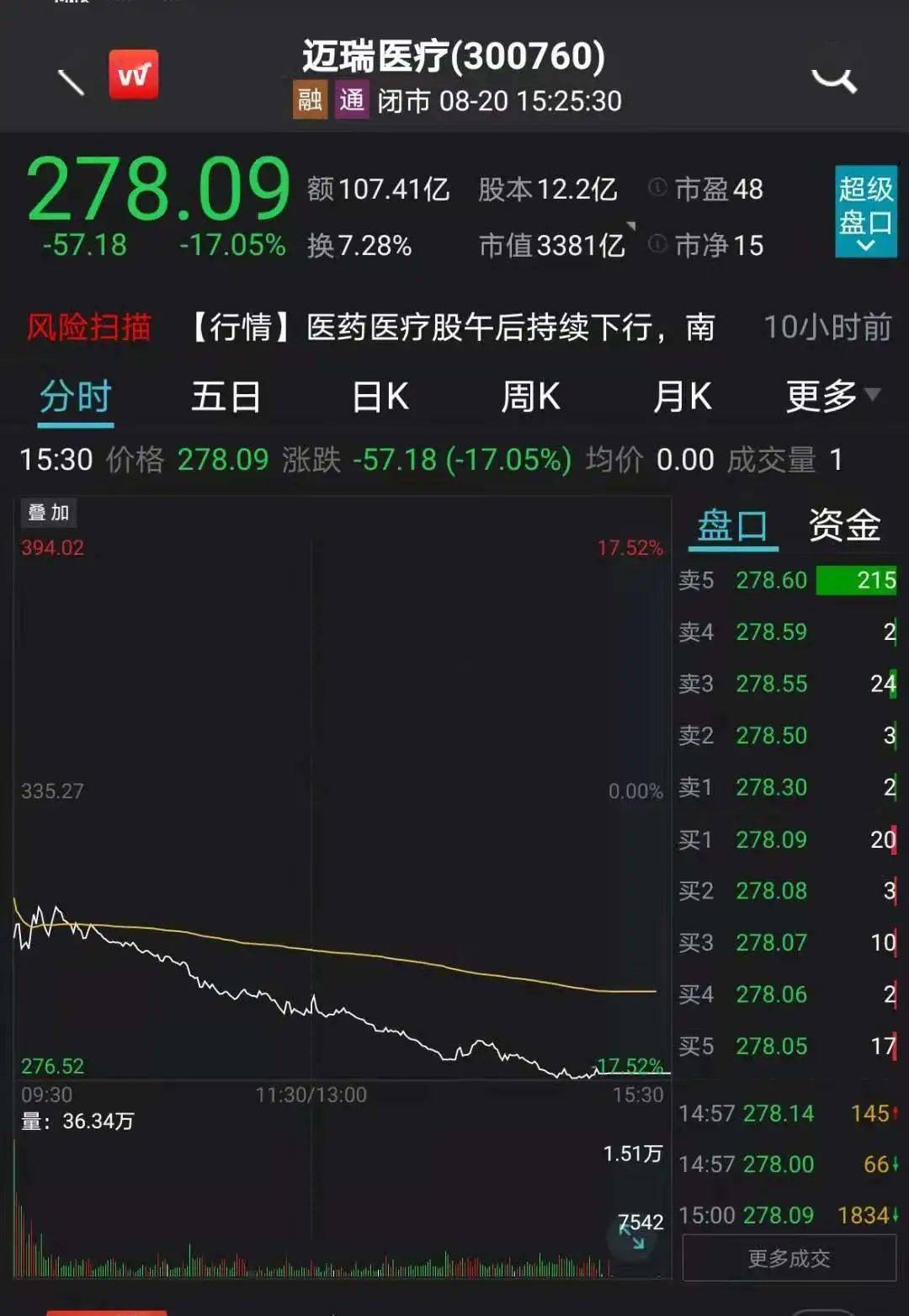 另外,市值三千亿的迈瑞医疗也崩了17%。