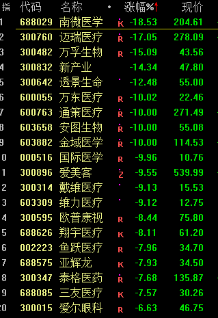 医药、医疗保健板块大幅走低,南微医学、迈瑞医疗跌幅超17%,恒瑞医药、诚意药业、信邦制药、通策医疗等跌停;