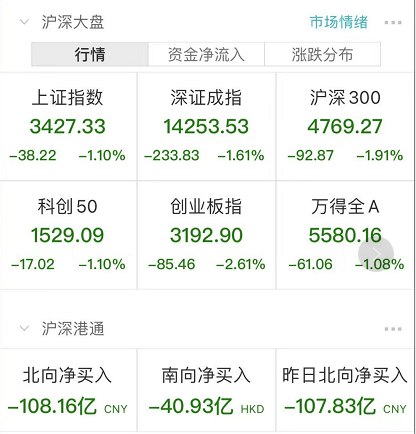 截至收盘,沪指跌1.1%报3427.33点,深成指跌1.61%报14253.54点,创业板指跌2.61%报3192.9点;两市合计成交12536亿元,北向资金净流出108.16亿元。