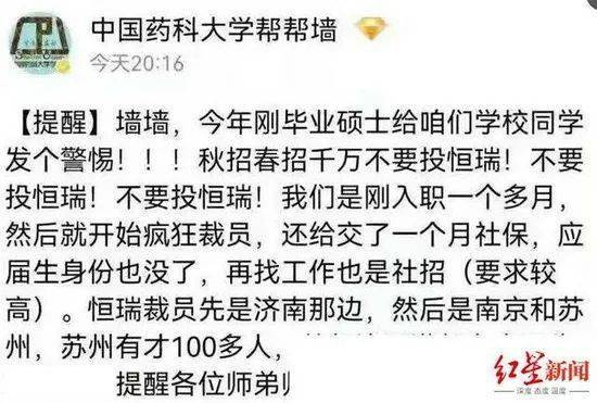 另外,一位自称是今年刚毕业的硕士还通过“中国药科大学帮帮墙”发送提醒称,“秋招春招千万不要投恒瑞!”该网友称,“我们刚入职一个多月,然后(恒瑞)就开始疯狂裁员。”据称,恒瑞医药裁员先是济南,然后是南京和苏州。