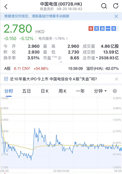 不过港股的电信,则是大跌了5%,AH溢价高达60%....