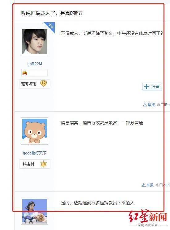 另外,在百度贴吧里,有网友发问,“听说恒瑞裁人了,是真的吗?”有网友留言称,“消息属实,销售行政裁员最多,一部分普通(员工)”。另有网友表示,“近期遇到很多恒瑞裁员下来的人”。