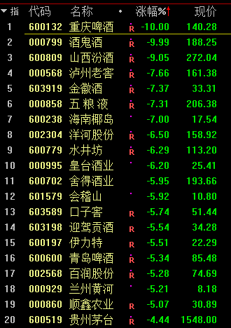 白酒股全天大跌,酒鬼酒午后一度跌停,贵州茅台跌超4%,午后未有反弹表现。重庆啤酒连续两天跌停。