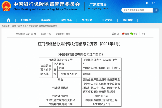 8月11日,行政处罚信息公开表江银保监罚决字〔2021〕4号显示,中国银行股份有限公司江门分行因贷款业务严重违反审慎经营规则,被中国银保监会江门监管分局罚款30万元。