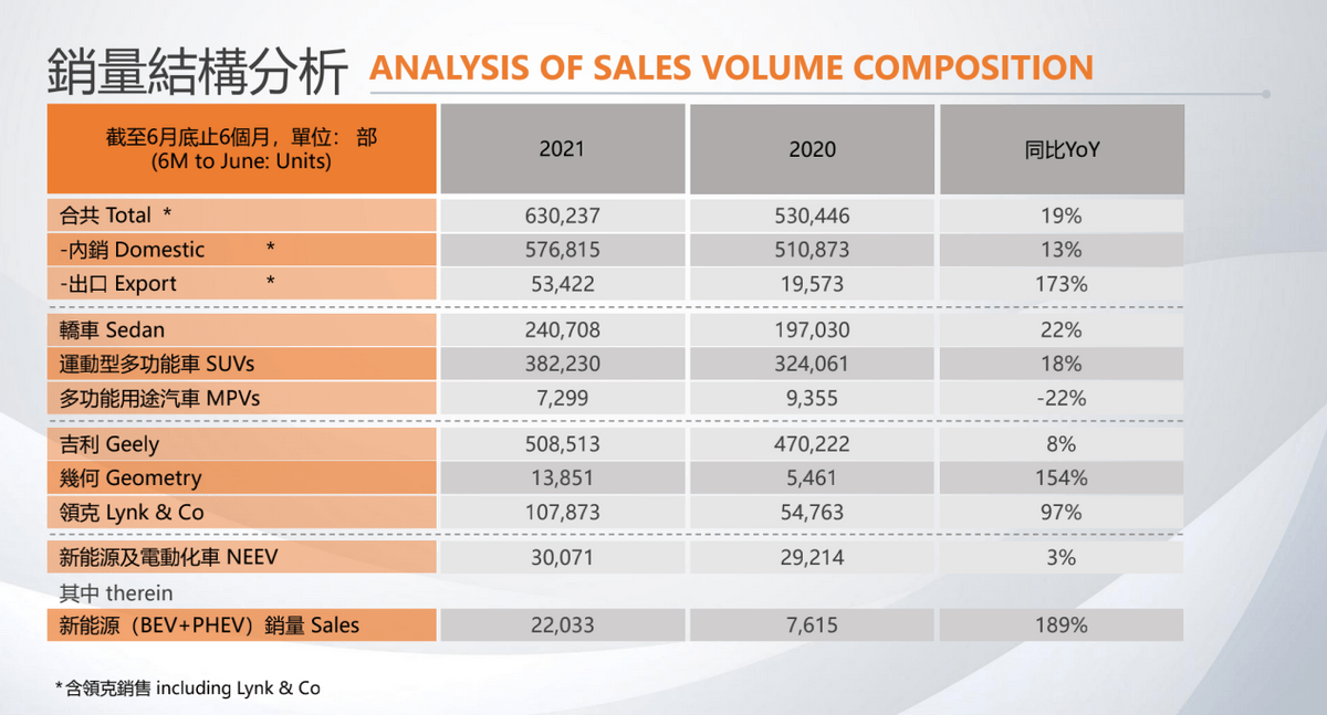 目前,吉利产品已实现东欧、中东、东南亚、非洲、南美等区域近30个国家和地区的覆盖,拥有海外销售和服务网点近400个。2021年1-6月,吉利汽车累计出口量达53422辆,同比上升约173%。(思维财经出品)■