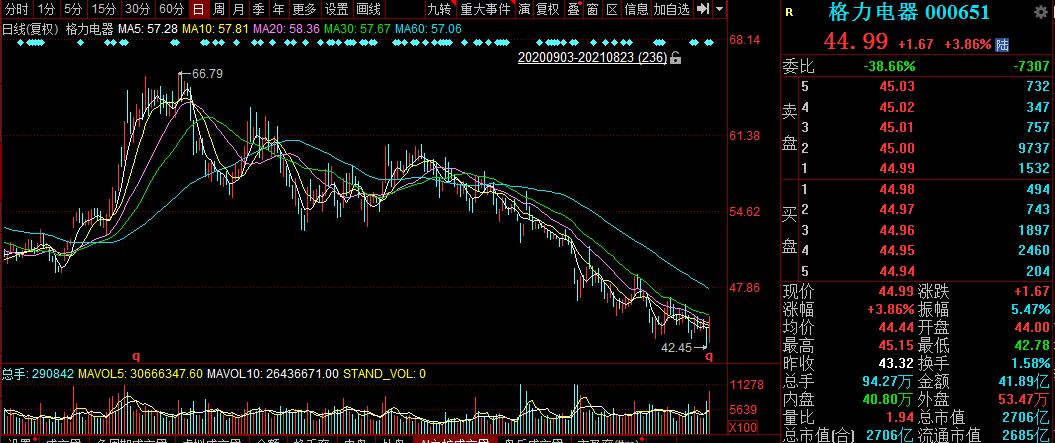 以格力电器为例,股价已经从年内高点66.79元调整到42.45元。