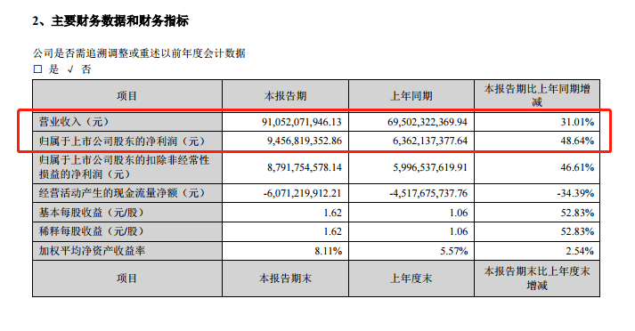 千呼万唤始出来!8月22日,格力电器终于披露了2021年的半年度业绩报告。根据业绩数据显示,2021年上半年,格力电器实现营业收入910.52亿元,同比增长31.01%;实现净利润94.57亿元,同比增长48.64%。