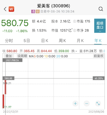 爱美客专业从事生物医用材料的研发、生产和销售,是国内医用软组织修复材料领域的领先企业。2021年上半年,公司实现营业收入6.33亿元,较上年同期增长161.87%;实现归属于上市公司股东的净利润4.25亿元,较上年同期增长188.86%。今年以来,爱美客股价累计涨幅超60%。