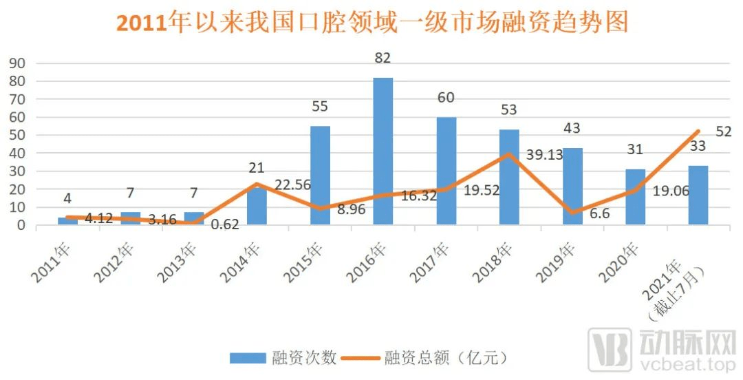 资本也迅速闻风而动。据动脉网统计,2021年上半年,口腔一级市场一共发生33起融资事件,融资总金额逾50亿人民币,达到了有史以来之最。其中,1亿美金以上的大额融资共有3起,6家企业在半年内获得两次及以上融资。