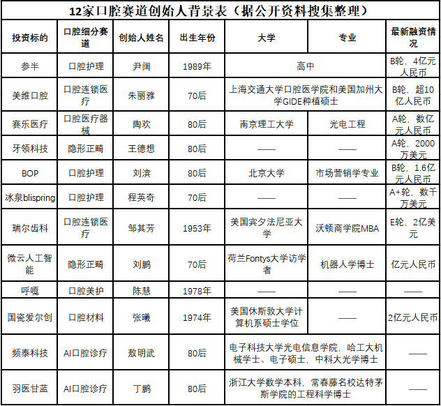 在热潮涌动之下,我们试图从12家上半年累计拿到口腔赛道一半多融资的企业创始人角度入手,来看看资本究竟青睐什么样的创始人?是不是只有名校口腔专业的硕博,才有机会完成“小目标“?答案即将揭晓。