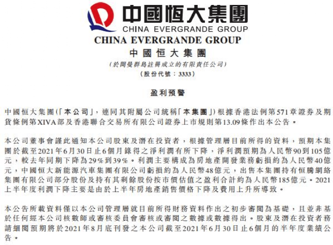 中国恒大在港交所发布公告称,预计2021年上半年净利润90-105亿元,同比下降29%-39%。恒大表示,集团利润主要构成为房地产开发业务亏损约为40亿元,中国恒大新能源汽车集团亏损约为48亿元,出售持有恒腾网络集团部分股份及持有其剩余股份按市价估值的盈利合计约为185亿元。2021上半年度利润下降,主要是由于上半年房地产销售价格下降及费用上升所导致。