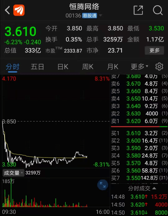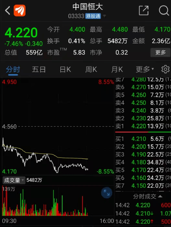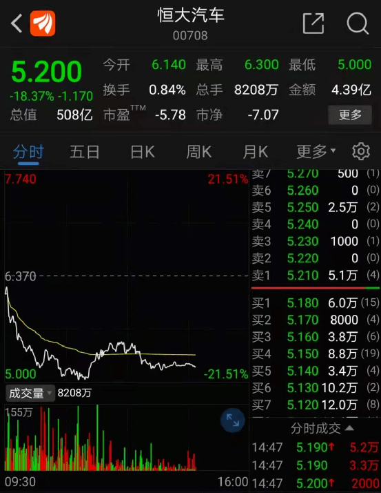 26日早间,恒大系四只股票全部低开,此后持续震荡向下,临近早盘收盘股价跌幅有所收敛。午后开盘维持低位窄幅震荡,截至记者发稿,中国恒大报4.22港元,跌7.46%;恒大物业报5.75港元,跌2.38%;恒大汽车报5.2港元,跌18.37%,成交量明显放大;恒腾网络报3.61港元,跌6.23%。