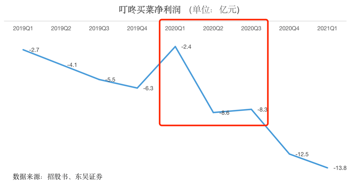 2020年前三季度,疫情期间的叮咚买菜由于客户规模增加,使得公司亏损有收窄迹象。在疫情最严重的第一季度,公司仅亏损2.4亿元,同比增长了10.86%,是近三年来亏损幅度最小的一个季度。