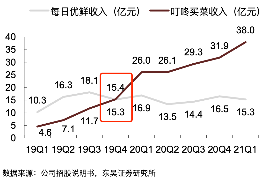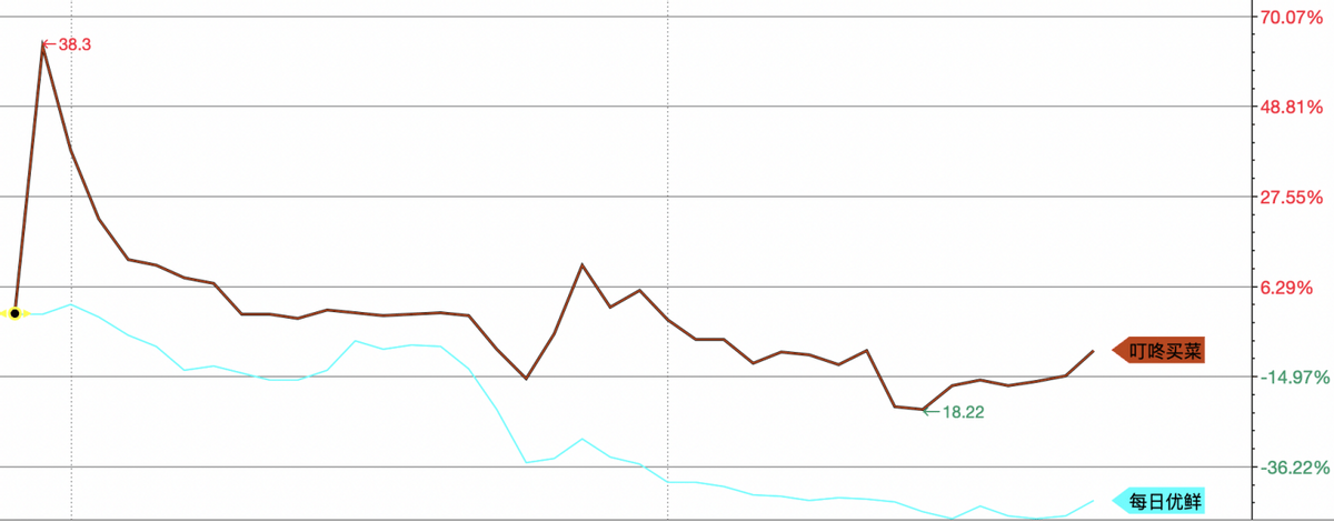 (叮咚买菜与每日优鲜股价走势)
