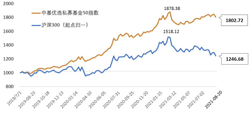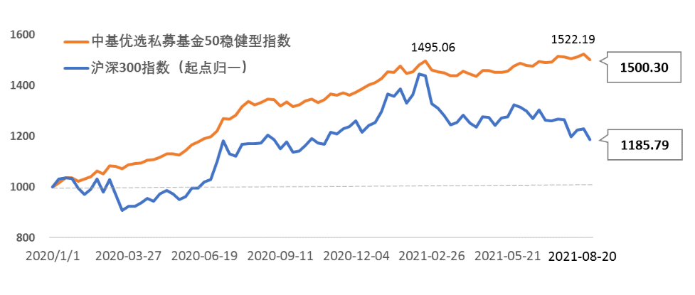 50指数的首个二级指数——中基优选私募基金50稳健型指数(以下简称“50稳健型指数”)的基准日为2020年1月1日,8月20日当周收于1500.30点,较8月13日当周下跌1.44%,近一年,50稳健型指数盈利13.40%。