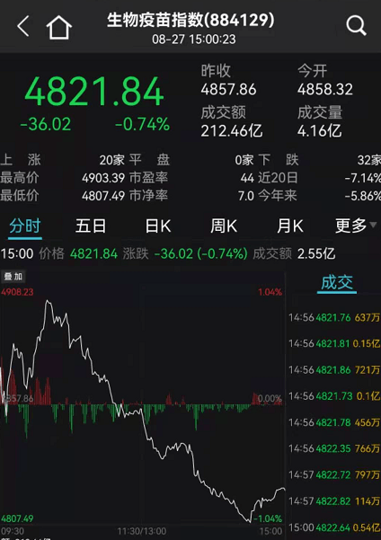 值得注意的是,整个生物疫苗板块也在不断走低。在早盘一度涨超1%后,便迅速走低,午后翻绿一度跌超1%。截至收盘收盘0.74%。