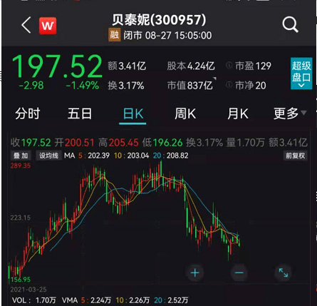 贝泰妮也跌破千亿市值,最新股价197.52元每股,市值837亿元。