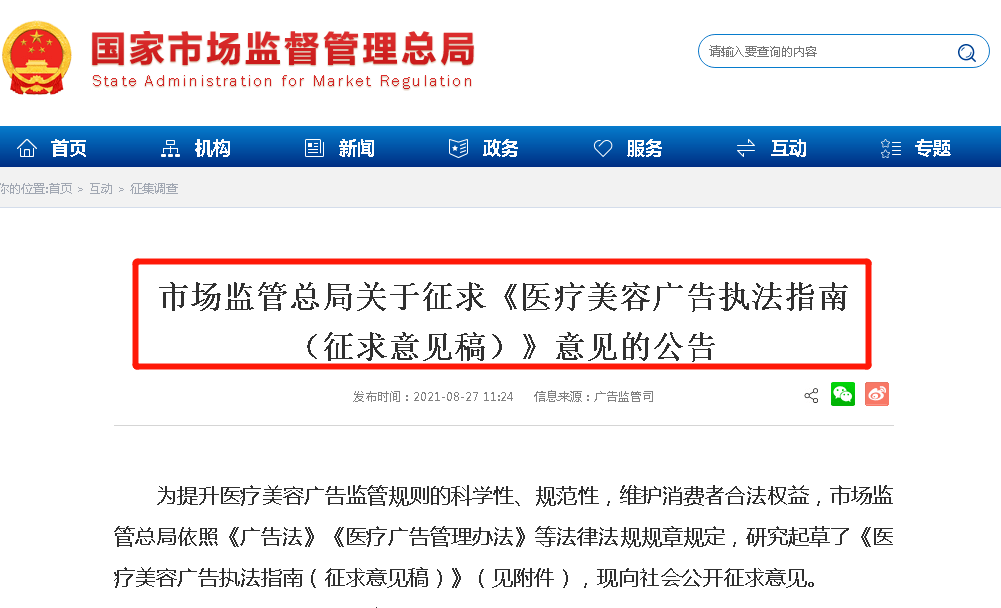 据 国家市场监督管理总局 网站8月27日消息,该局就《医疗美容广告执法指南(征求意见稿)》征求意见。