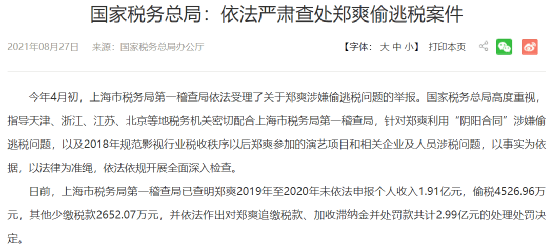 8月27日,国家税务总局依法严肃查处了郑爽偷逃税案件,坐实郑爽通过“阴阳合同”偷逃税款共计7100多万元,为此国税总局对郑爽作出追缴税款、加收滞纳金并处罚款共计2.99亿元的处理处罚决定。