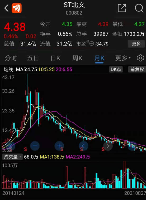 事端不断的北京文化股价自2015年牛市高点后,便一直处于下降通道,从2015年最高的43.17元跌至今日收盘的4.38元,股价跌去近九成,期间出现过多次暴跌。如今年4月底5月初,在被实施ST叠加郑爽“阴阳合同”事件影响,北京文化在10个交易日里出现7个跌停。