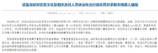 同日,证监会也出手了,对郑爽牵涉的上市公司北京文化进行处罚。北京文化子公司世纪伙伴在2018年虚假转让《倩女幽魂》和《大宋宫词》两部电视剧的项目投资份额收益权,虚增收入4.6亿元,虚增净利润1.91亿元,2018年年度报告存在虚假记载。北京证监局拟依法对公司及董事长宋歌、董事张云龙等17名当事人予以行政处罚,并对时任副董事长娄晓曦采取证券市场禁入措施。