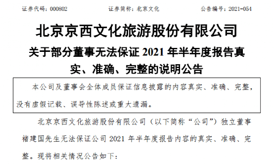 公告称,公司独立董事褚建国无法保证公司2021年半年度报告内容的真实、准确、完整,理由如下:“鉴于本人对公司2020年年度报告持反对意见,且财务报告存在连续性,而根据公司提交董事会审议的相关资料和本人要求公司提供的补充资料,本人无法确定其对公司 2021年半年度报告的影响。此外,公司未能提供东方山水项目相关文件,本人无法判断其对公司2021年半年度报告的影响”。