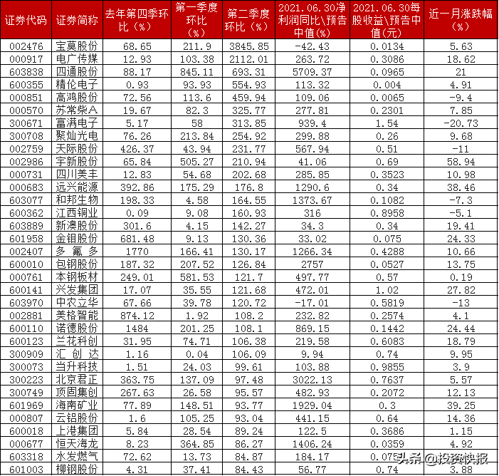 根据iFinD数据统计,在近3个季度业绩环比持续增长的203家上市公司,第二季度净利润增幅最多的有宝莫股份、电广传媒、四通股份、精伦电子、高鸿股份、苏常柴A、富满电子、聚灿光电、天际股份、宇新股份、四川美丰、远兴能源、和邦生物、江苏铜业、新澳股份、金钼股份、多氟多、包钢股份、本钢股份、兴发集团、中农立华、美格智能、诺德股份、兰花科创、汇创达均有超100%的上涨。