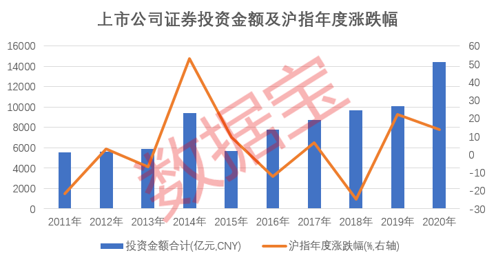事实上,从公开数据显示,上市公司证券投资最早可追溯到2003年, 深振业A投资了14只证券,投资标的包括天 健集团、鄂武商A等。从近十年的数据来看,2011年至2020年, 上市公司证券投资金额基本上稳步提升,2020年达到1.44万亿元,创历史最高水平,占A股市值(6月30日)近2%;