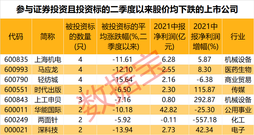 常在河边走,哪有不湿鞋,不少公司也有被深套的, 皖维高新投资的 ST凯乐二季度以来股价遭腰斩,投资的 东瑞股份、中农联合、泰坦股份等二季度以来跌幅均超过25%。另外,8家公司(投资2家以上A股的27家公司)的投资标的全军覆没,二季度以来均下跌,包括 上海机电、马应龙、上工申贝等。