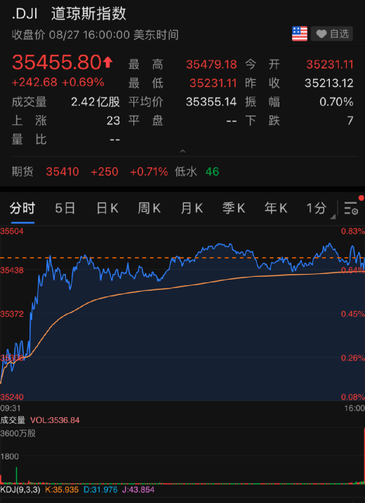 截至收盘,道琼斯指数涨0.69%,涨超240点,报35,455.80点;标普500指数涨0.88%,报4,509.37点,创新高;纳斯达克综合指数涨1.23%,报15,129.50点,创新高。