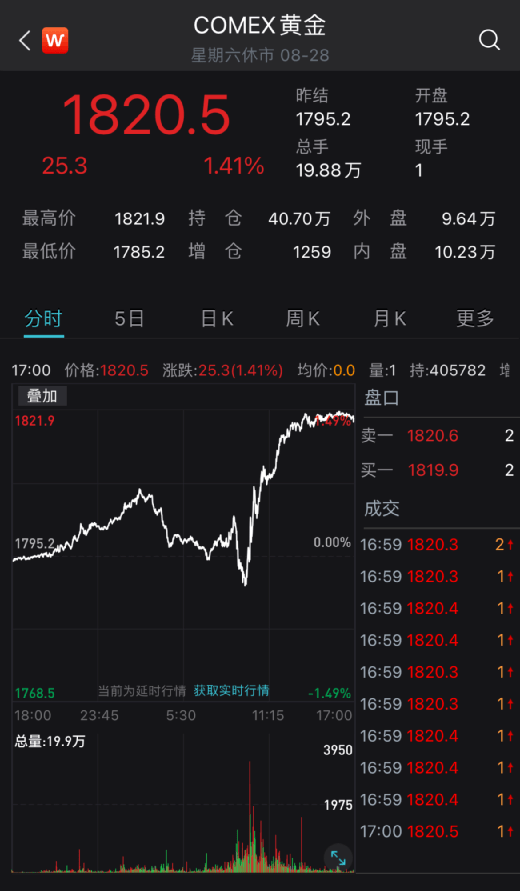 黄金则直线拉升,突破1820美元/盎司关口。