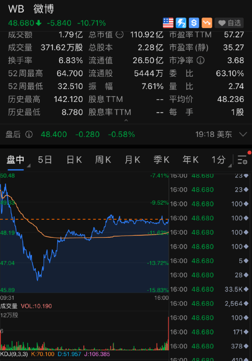 新氧、微博大跌近11%