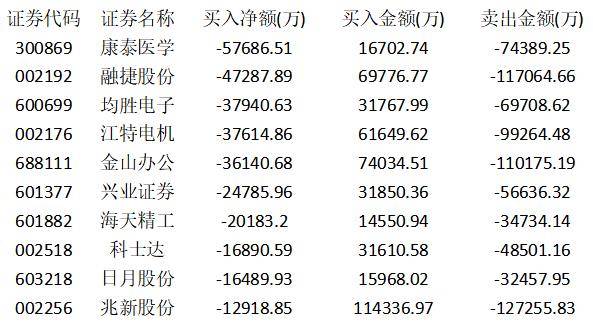 从表二主力卖出净额前列的个股来看,本周主力总体的抛压力度增大,共有16只个股卖出净额超过亿元,分别是康泰医学、融捷股份、均胜电子、江特电机、金山办公、兴业证券、海天精工、科士达、日月股份、兆新股份、皓元医药、中色股份、康德莱、锌业股份、高测股份、联科科技。