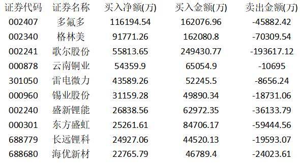具体来看,锂电池概念依然是市场最强板块,本周多氟多被资金买入最多。在锂电池材料高景气度之下,锂电池板块今年以来保持持续活跃。机构人士认为,从资源供给与需求来测算,锂的供给存在很明显的缺口,后期的供给缺口可能会越来越明显。这将会使整个锂资源行业持续受益。从多氟多资金买入情况来看,深股通买入最多,买入11亿元,游资国泰君安宁波彩虹北路营业部买入1.3亿元,游资银河证券绍兴营业部买入8888万元,机构买入8802万元。天风证券指出,“碳酸锂、氢氧化锂价格上涨,资源供给量比较大以及拥有库存比较高的公司最为受益。同时,因为锂企业的库存都是锂精矿的形式存在,碳酸锂和氢氧化锂并不适合存储,所以在价格上涨过程中,锂加工为主的企业也会因为拥有锂精矿库存和锂精矿包销长协而随之受益。以氢氧化锂为例,全球能做到氢氧化锂产能上万吨的公司不足10家,氢氧化锂现在的绝对龙头是赣锋锂业,除了国内供应,它的产品还一直供应海外以及特斯拉产业链,虽然公司的资源自给率不高,但是公司一直保有一定量的库存,并且采用平均成本法计价,在价格上涨中可以较为充分地获益。”