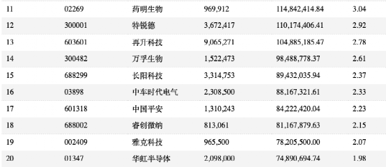 截至二季度末,第11至20大重仓股分别为药明生物、特锐德、再升科技、万孚生物、长阳科技、中车时代电气、中国平安、睿创微纳、雅克科技、华虹半导体,除了华虹半导体外,其余股票市值占基金净值比均在2%以上。