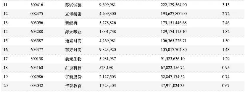 从隐形重仓股来看,位居第11-13位大重仓股的苏试试验、立讯精密、新经典的基金持股市值占基金净值比在2%以上;位居第14-20大重仓股的海天味业、地素时尚、东方时尚、晨光生物、汇顶科技、宇新股份、传智教育。其中,传智教育首次出现在该基金的持股名单中。