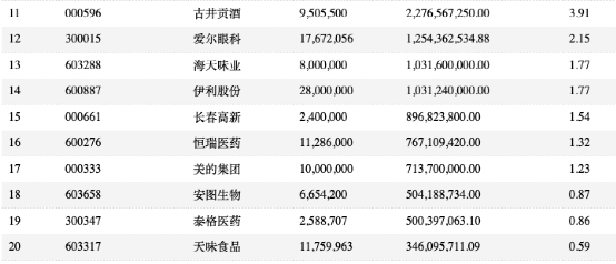 除了此前已披露的十大重仓股之外,第11-20大重仓股分别为古井贡酒、爱尔眼科、海天味业、伊利股份、长春高新、恒瑞医药、美的集团、安图生物、泰格医药、天味食品,上述10只重仓股占基金净值的比重超过16%。上述10只股票属于白酒、医药及食品饮料行业。