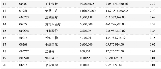 从隐形重仓股来看,位列第11-14大重仓股的恩捷股份、迈瑞医疗、宁波银行、药明生物的基金持股市值占基金净值比例在3%以上,位列15-20大重仓股的药明康德、水井坊、恒瑞医疗、美的集团、安井食品、绝味食品,占基金净值比超过2%。