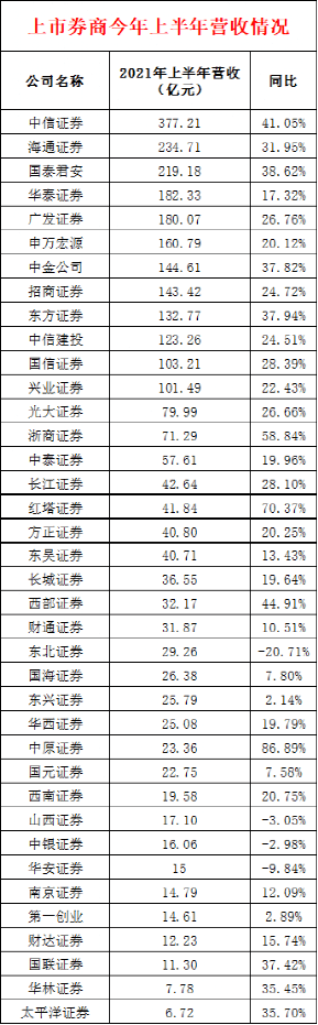 具体来看,12家券商上半年营收超过100亿元,其中,3家券商营收更是超过200亿元。