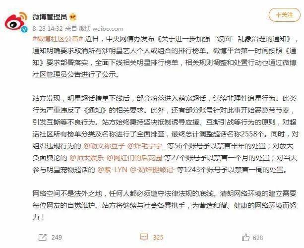 据@微博管理员,8月28日下午发布微博社区公告:近日,中央网信办发布《关于进一步加强“饭圈”乱象治理的通知》,通知明确要求取消所有涉明星艺人个人或组合的排行榜单。微博平台第一时间按照《通知》要求部署落实,全面下线相关明星排行榜单,相关规则调整和处置行动也通过微博社区管理员公告进行了公示。