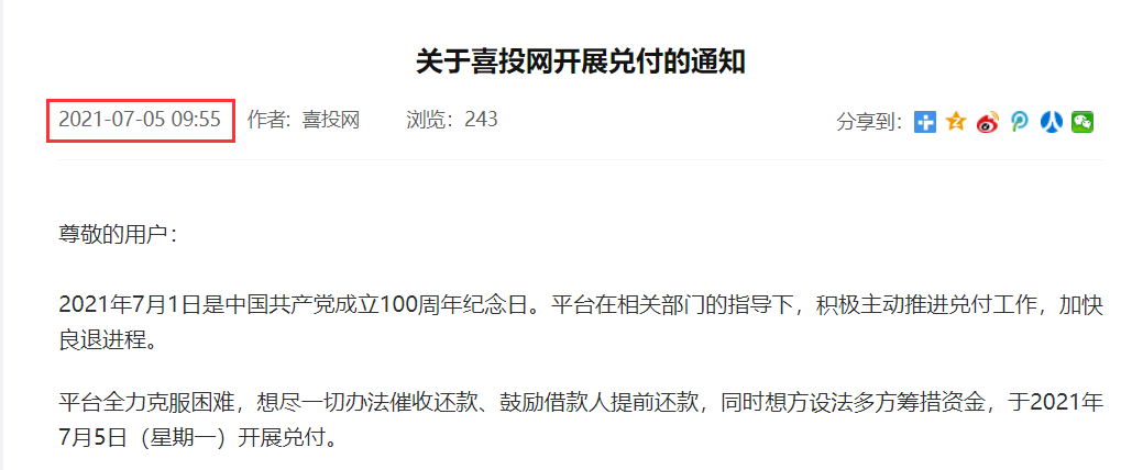 值得注意的是,就在7月5日早上9点55分,喜投网刚发布了开展兑付的通知。